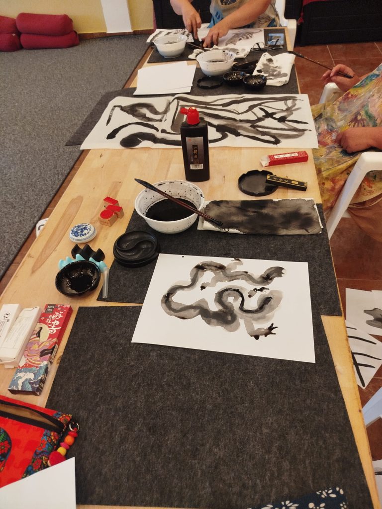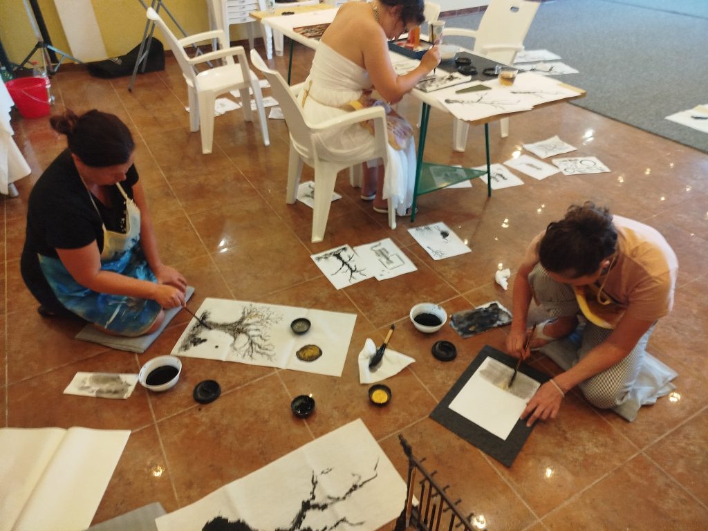 The workshops are performed within 2 hours, and are divided into an introductory part, demonstration exercises in maneuvering with a brush and ink, and final work on the selected medium. During the workshops throughout the week, we will use various techniques and media such as rice paper, bamboo paper, paper plates for sumi-e painting, fans, lanterns and sunshades.