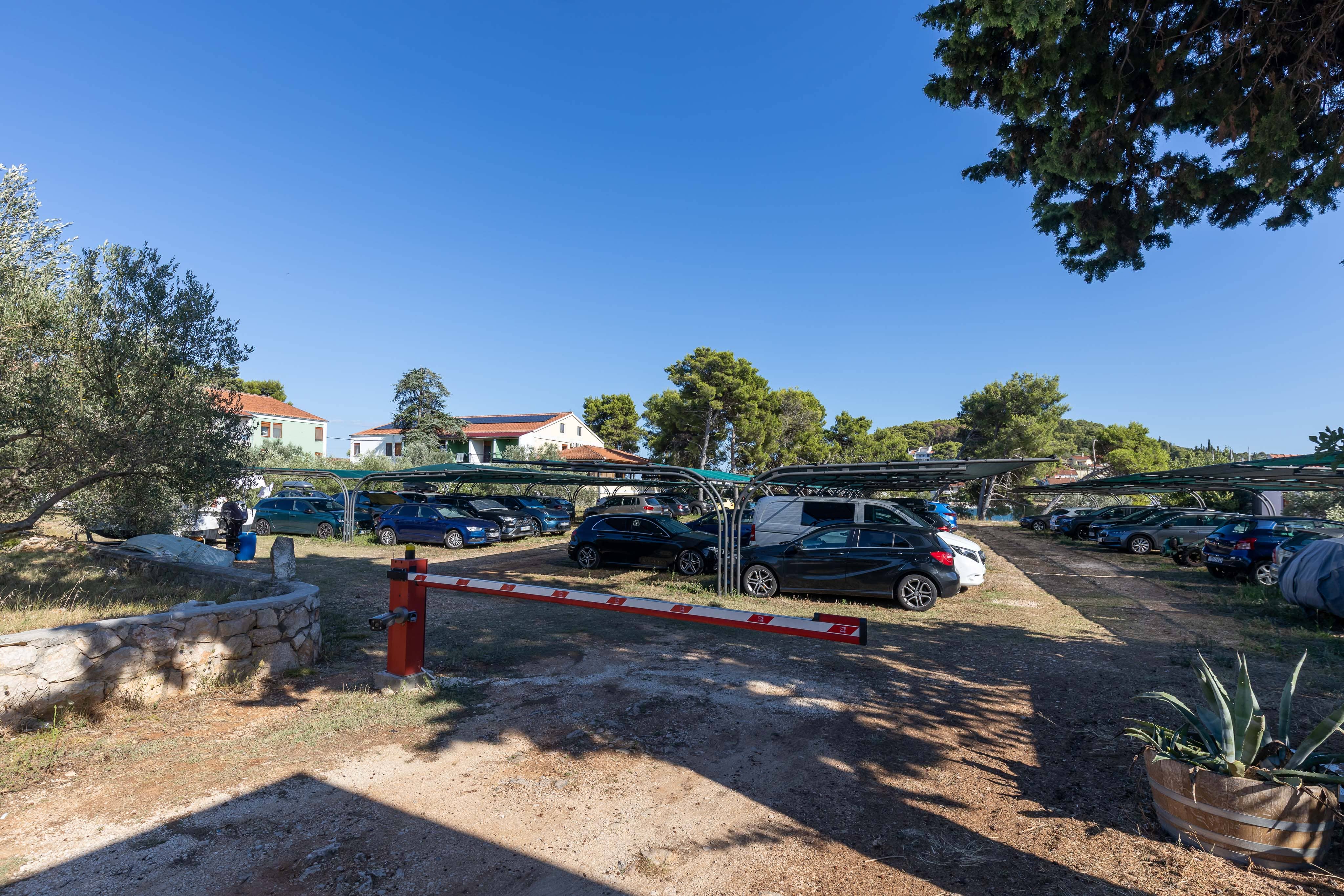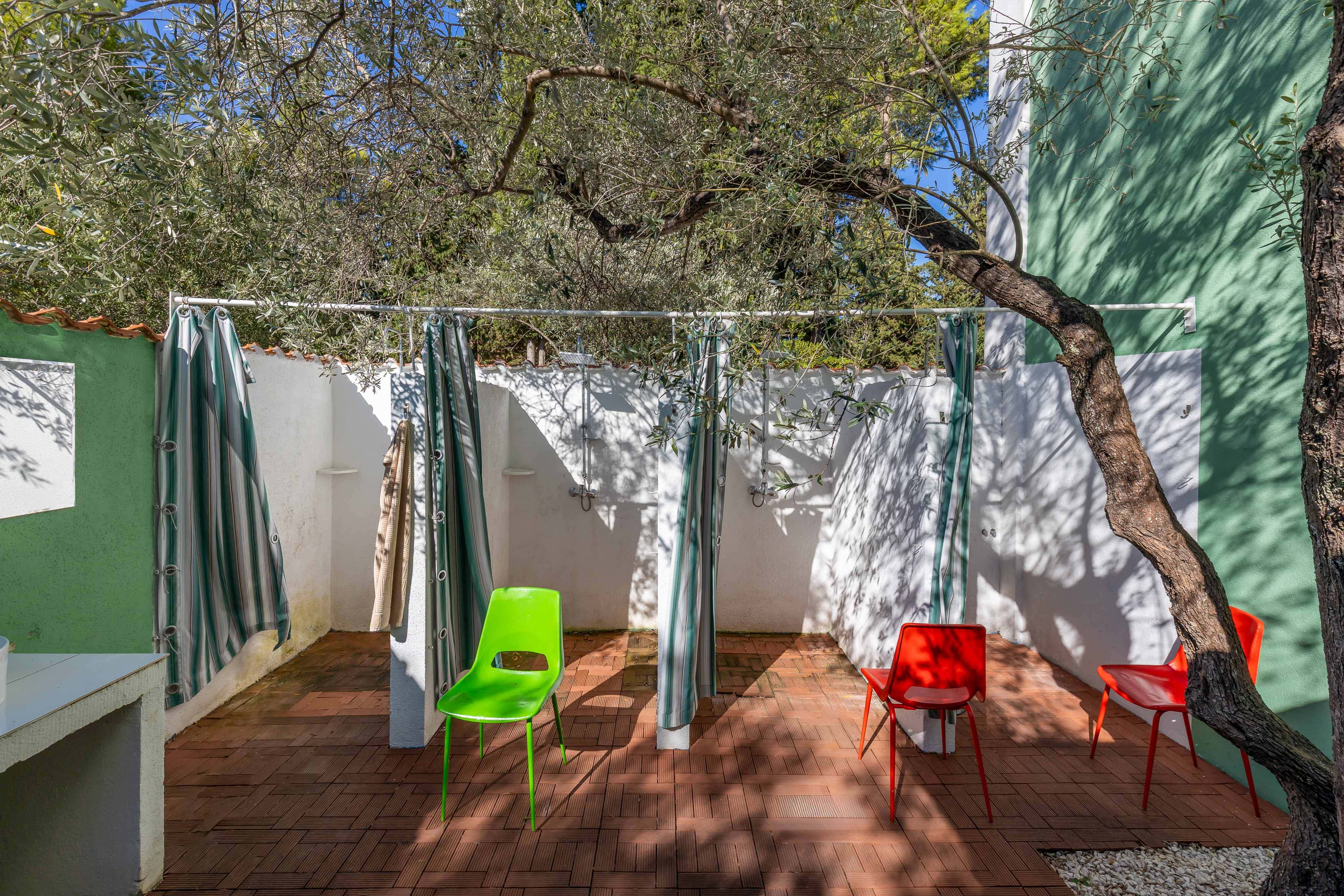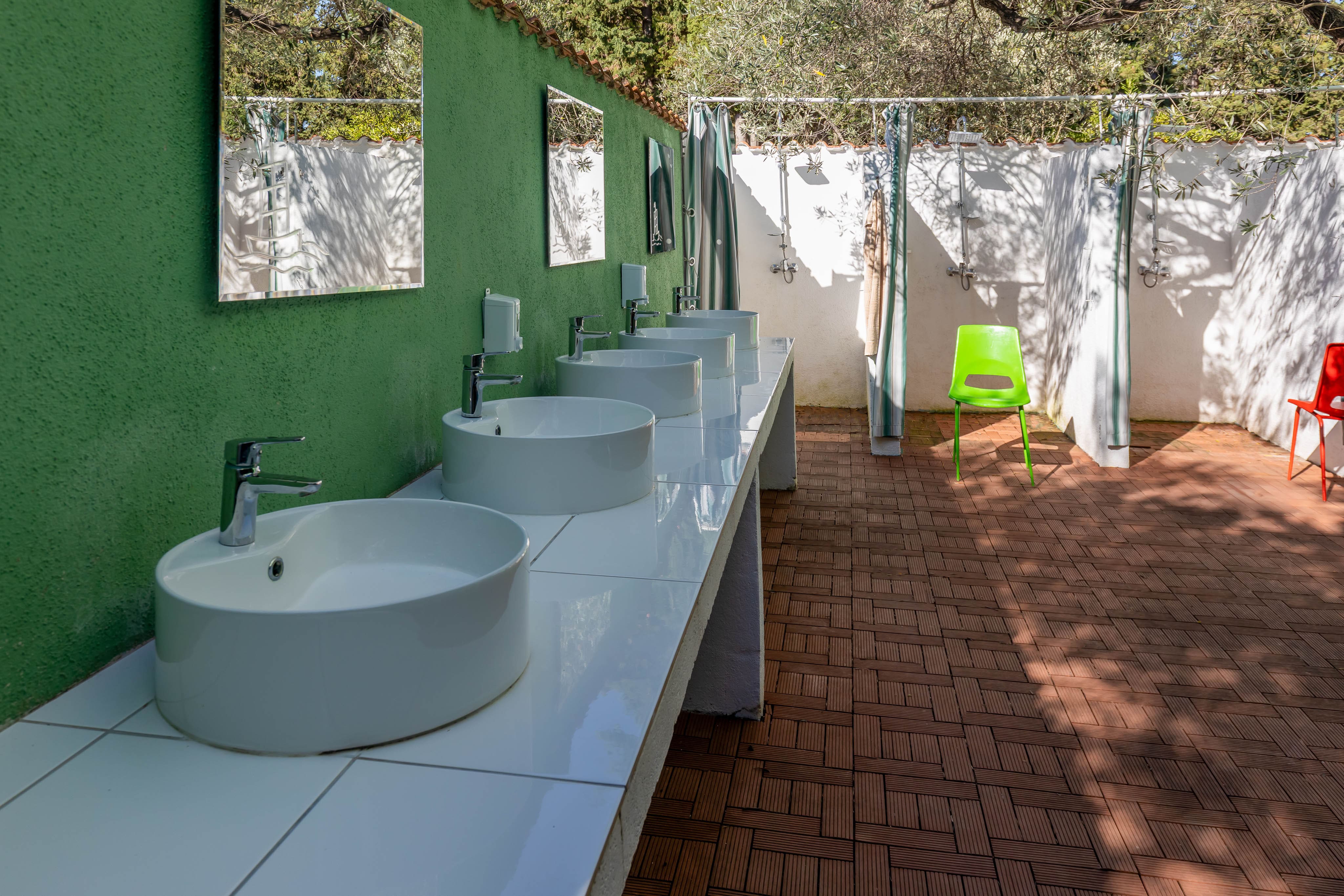 There are nearby shared sanitary block with showers, toilets, sinks and essentials.